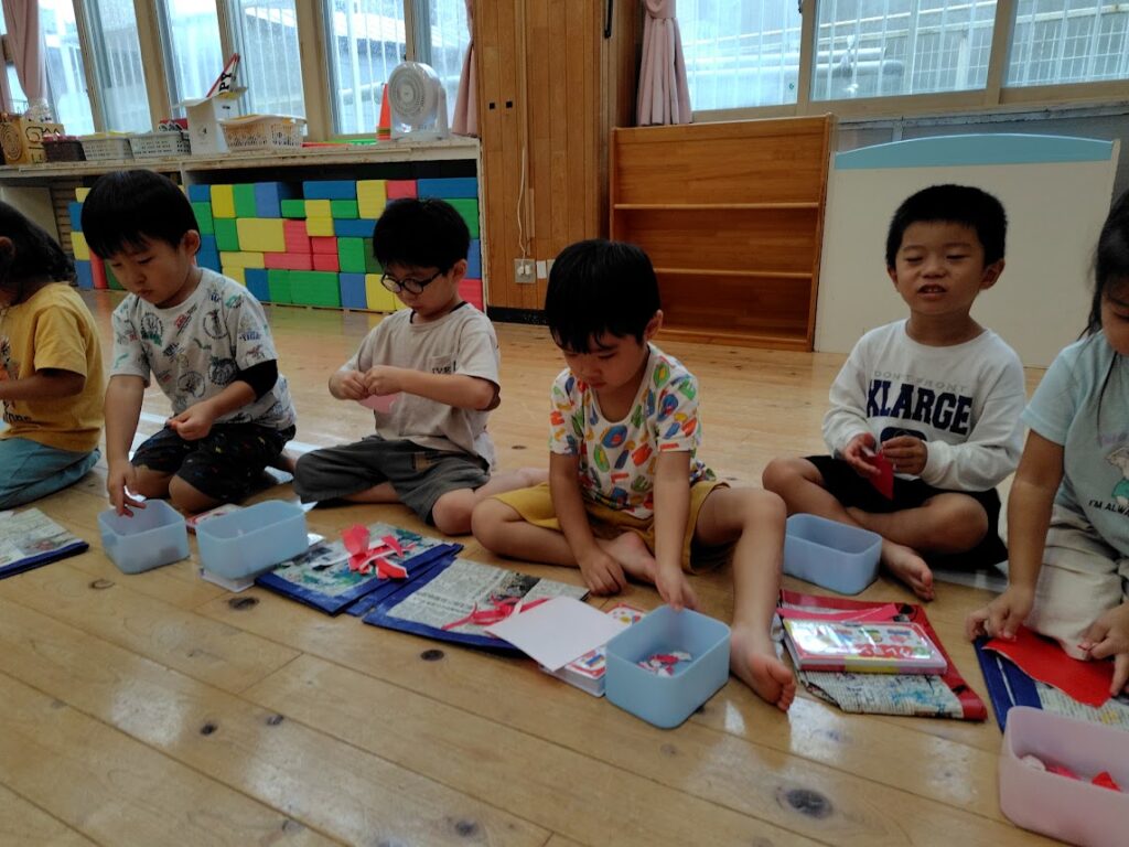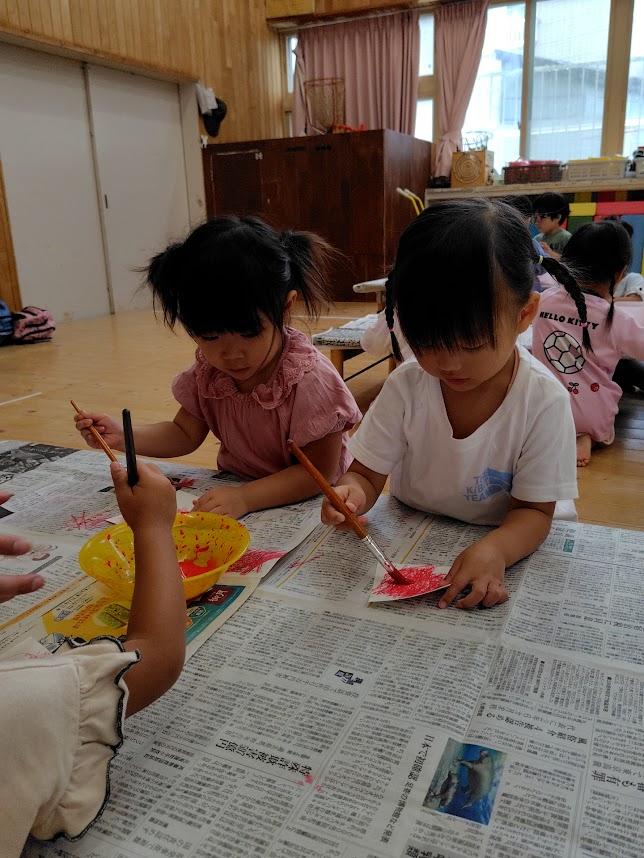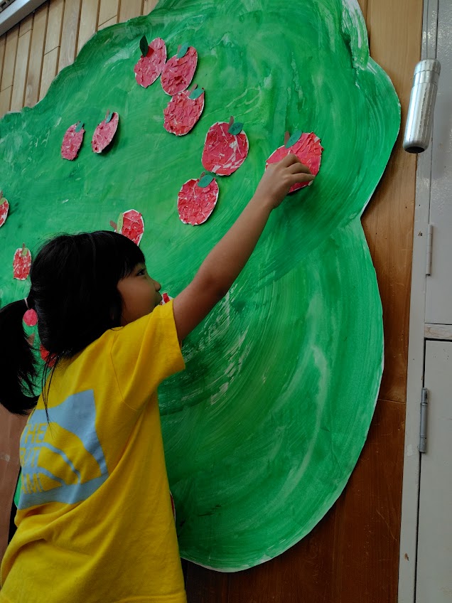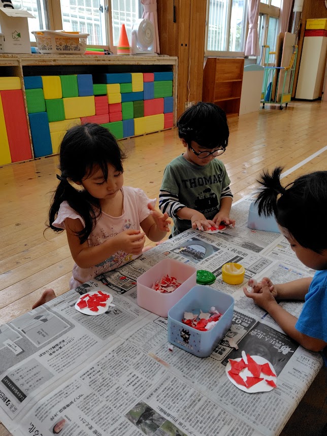 3・4・5歳児はちぎり絵をして、りんご製作です☆彡