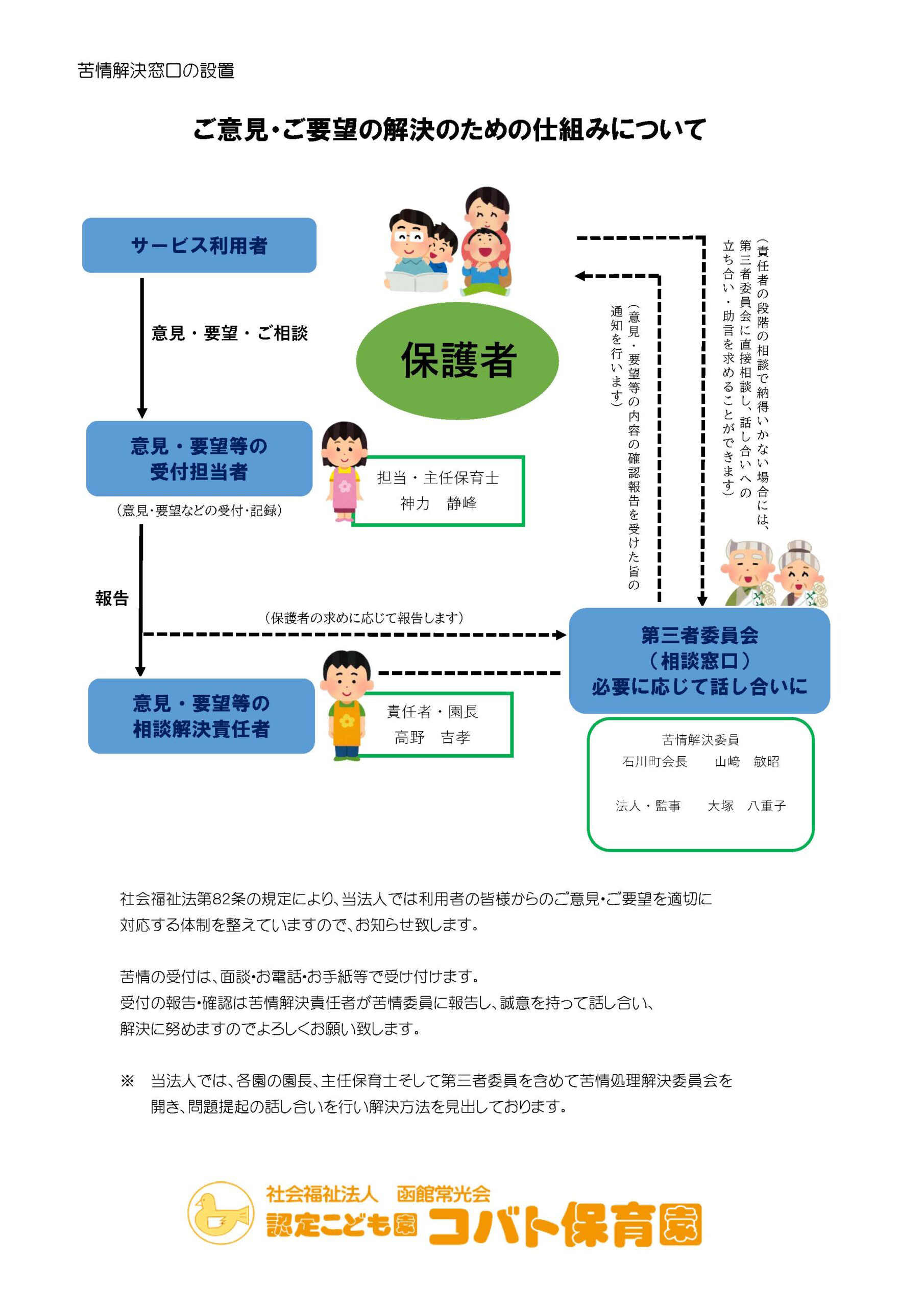 ※当法人では、各園の園長、主任保育士そして第三者委員会を含めて苦情処理解決委員会を開き、問題提起の話し合いを行い解決方法を見出しております。